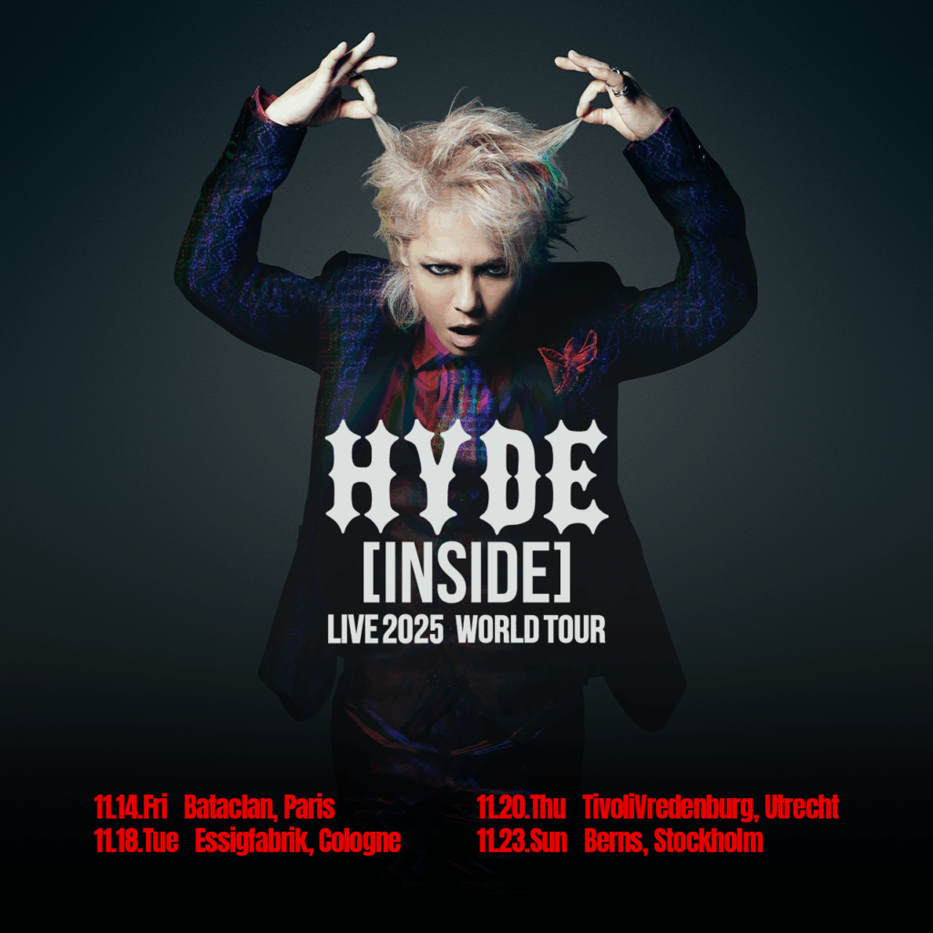 De Japanse rockicoon HYDE heeft vier extra Europese concerten aangekondigd als onderdeel van zijn aankomende HYDE [INSIDE] LIVE 2025 WORLD TOUR. De nieuwe tourstops zijn Frankrijk, Duitsland, Nederland en Zweden. Deze aankondiging markeert HYDE’s eerste optredens in de regio sinds de succesvolle VAMPS-tour door het Verenigd Koninkrijk in 2015.